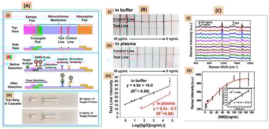 (A) Principle and operation mechanism of SERS paper-based lateral flow strip (PLFS). (i) Top view and side view of PLFS; (ii) before and after detection of target protein; (iii) pictures of PLFS cassettes with positive and negative results; (B) pictures of colorimetric PLFS and calibration plots for detection of IgG (0~50 µg/mL (i) in PBS buffer and (ii) PBS and blood plasma ratio of 90:10; (iii) calibration curve in PBS (black) and a mixture of PBS and blood plasma (red).; (C) (i) SERS spectra (ii) SERS-PLFS with MBA as Raman reporter for detection. Insert: calibration plot obtained from the Raman intensity against NSE concentration. Adapted from [208], with copyright permission under the terms of the CC-BY-NC-ND 3.0 license.