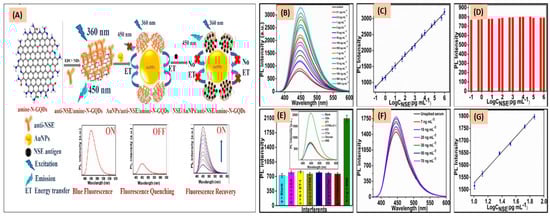 A multiplex immunoassay for the detection of three different lung cancer biomarkers targets CEA, CYFRA21-1, and NSE. The construction of the sensing platform consists of the integration of suspension and a planar microarray with a single layer of polydimethylsiloxane (PDMS) made using soft lithography technology. The suspension format creates a sandwich of target protein between the two antibodies conjugated with magnetic beads and quantum dots by antigen–antibody interactions. The microarray is produced by an array of microwells in PDMS. Each microarray captures a single bead and leads to the formation of a microbead array in the chamber of PDMS. This microarray system can be used for the simultaneous detection of all three lung cancer biomarkers in 10 µL serum in the dynamic range of 1.03–111 ng/mL for CEA and CYFRA21-1 and 9.26–1000 ng/mL for NSE. The LODs for CEA, CYFRA21-1, and NSE were 0.19 ng/mL, 0.97 ng/mL, and 0.37 ng/mL respectively [115]. The image of the fabricated beads-based microarray biosensor system and the results are shown in Figure 6. Chen et al. reported an electrochemical CYFRA21-1 DNA biosensor based on a nanocomposite composed of carboxyl-functionalized graphene oxide (GO-COOH) and copper oxide nanowires (CuO NWs). Hybridization between the probe and target DNA was monitored with differential pulse voltammetry using methylene blue as a redox indicator. Under optimal conditions, the device quantified CTFRA21-1 in a linear range of 1 µM to 1 pM with an LOD of 0.118 pM [116]. Joshi et al. reported a portable and rapid electronic biosensor device based on reduced graphene oxide (rGO), melamine (MEL), antibodies, and bovine serum albumin (BSA) to quantitatively detect CYFRA21-1 in saliva. The device was tested from 1 pg/mL to 800 ng/mL of CYFRA21-1 and the corresponding response of the sensors ranged from 6.18% to 64% [117]. Jian et al. used an electrochemiluminescence (ECL) immunosensor based on an electrochemically induced atom transfer radical polymerization (eATRP) process to detect CYFRA21-1. The primary antibody was immobilized on the electrode surface and the secondary antibody was used in a sandwich assay with N-acryloyloxysuccinimide as the functional monomer. The combination of ECL and eATRP immunosensor technology demonstrated a linear relationship in the range of 1 fg/mL to 1 μg/mL with a LOD of 0.8 fg/mL [118]. Alarfaj et al. used carbon dots decorated with a ZnO nanocomposite as a fluorescent probe for the sensitive detection of CYFRA21-1 via sandwich immunoassay. BM19.21 monoclonal antibody was conjugated to a homemade carbon quantum surface. Another monoclonal antibody (KS 19.1) was physically adsorbed onto the surface of microtiter wells. In the presence of CYFRA21-1, an antibody–antigen–antibody sandwich pattern was formed and the quantity of CYFRA21-1 was monitored via changes in the fluorescence signal.