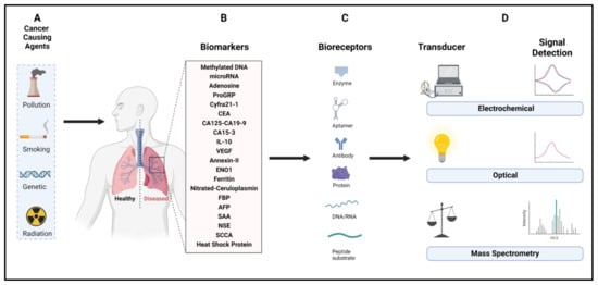 Schematic representation of lung cancer induced by various tumor-causing agents and the detection of cancer by biosensing methodologies. (A) Variable cancer-causing agents such as smoke, pollution, exposure to radiation, and genetic effect lead to liver cancer; as a result, many biomarkers are produced at the usual levels and released in the body fluids. (B) Liver-cancer-associated biomarkers including methylated DNA, microRNAs, and genes are listed. Biosensors are developed based on the recognition of biomarkers by the bioreceptors, which are integrated with the transducer and the signal amplification systems. (C) Different types of bioreceptors can recognize the biomarkers and transfer the signal to a (D) signal amplifier that amplifies the signal to a readable format (generated from biorenders.com, accessed on 12 June 2023).