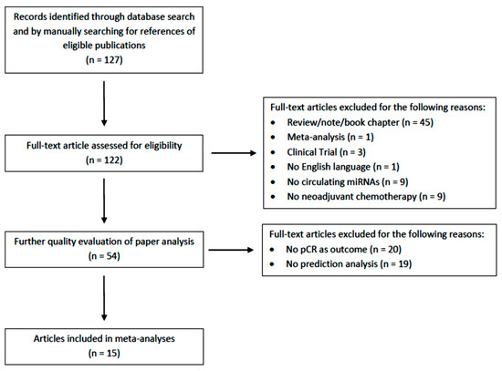 In order to identify relevant studies, we conducted a comprehensive literature search, without time limits, on PubMed, Cochrane Library, EMBASE, Scopus, and Web of Science for all relevant studies published until 16 February 2023. We also retrieved abstracts from major international conferences from the last two years (namely, American Society of Clinical Oncology (ASCO), European Society of Medical Oncology (ESMO) and ESMO Breast, and San Antonio Breast Cancer Symposium (SABCS)) in order to identify potentially eligible unpublished studies. The article search was performed using the following search strategy: (Circulating OR Plasma OR Blood OR Serum) AND (microRNA OR miRNA) AND (breast AND Cancer) AND (neoadjuvant OR preoperative AND chemotherapy). In addition, other relevant studies were identified by manually searching for references of eligible publications. Additionally, a manual search was conducted on Google Scholar and ClinicalTrials.gov [33] as a complementary search. No language restrictions were applied in the database search so as to identify all relevant publications.