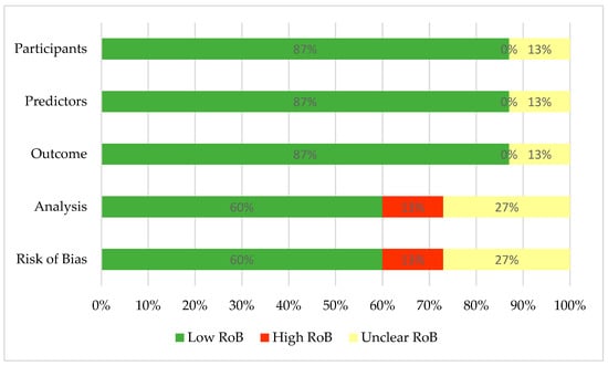 Overall, nine studies (60%) [26,28,55,56,58,59,60,62,63] received a “low ROB”, four studies (27%) [57,61,65,66] were assigned an “unclear ROB” rating, and two studies (13%) [54,64] were assigned a “high ROB”. The omission of appropriate statistical analysis for predicting model validation and information in the first three domains (i.e., participants, predictors, and outcome) was a frequent source of bias in terms of high and unclear judgment. Supplementary Table S1 and Figure 2 display the results of the risk of bias analysis.