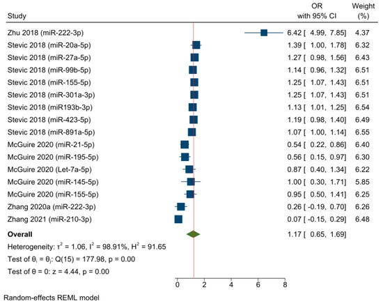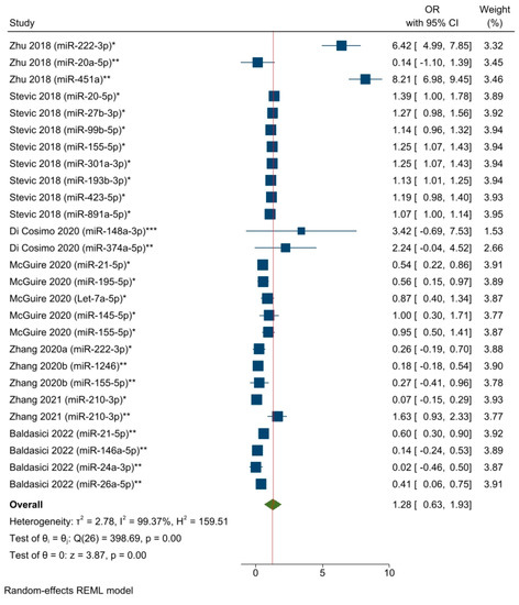 Eight studies (corresponding to 27 effect size results) analyzed the associations between specific circulating miRNAs and the response to NAC (Figure 3). All the results were obtained from univariate logistic regression models, except for two studies [55,58] that utilized multivariate logistic regression [67]. The overall pooled OR results included different circulating miRNAs detected from blood samples (i.e., serum, plasma, and whole blood) at different time points (as a single detection before starting or during the first cycles of NAC and changes in miRNA levels from multiple detections) in a mixed BC population. The selected miRNAs were found to be associated with the pCR rate (OR = 1.28, 95% CI 0.63–1.93, SE = 0.33, p < 0.05). The use of a random effect model was plausible due to high heterogeneity across the studies, i.e., I2 = 99.37%, and the Q-statistic was significant (chi2 (26) = 398.69; p < 0.05). Unfortunately, the performance of a subgroup analysis or meta-regression was not feasible given the small number of eligible studies and the limited commonality between the studies’ variables. To evaluate the impact of probable outliers on the calculation of the overall effect size, we ran a leave-one-out sensitivity meta-analysis (Supplemental Figure S2). The removal of the first and third results [55] appeared to have a more significant effect (compared to other studies) on assessing the total effect size. Specifically, omitting the first result reduced the overall ratio by around 0.2, while eliminating the third result decreased the overall ratio by nearly 0.3. In addition, we conducted a sensitivity analysis by excluding the results concerning miR-21-5p and miR-155-5p, as the predictive roles of these circulating miRNAs were separately analyzed. The aim was to assess the predictive significance of the remaining miRNAs. The analysis showed results that were similar to the general estimation: OR = 1.44, 95% CI 0.63–2.25, and p < 0.05 (Supplementary Figure S3).