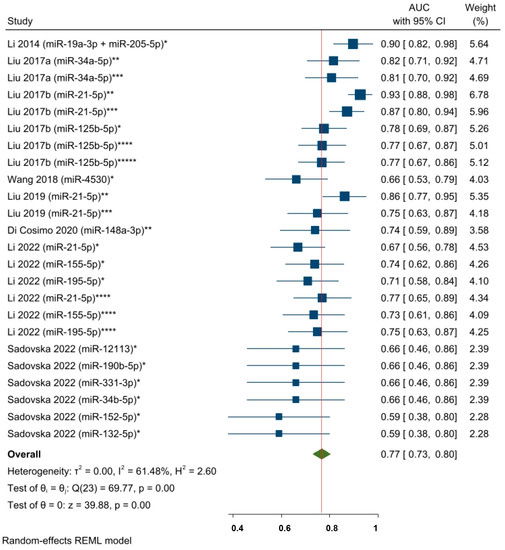 Eight studies (corresponding to twenty-four effect size results) analyzed the predictive power of specific circulating miRNAs and the response to NAC in a mixed population of BC patients (Figure 5). The overall pooled AUC results included specific miRNAs expressed at different timepoints (as a single detection before starting or during the first cycles of NAC and changes in miRNA levels from multiple detections) in serum and plasma samples. The pooled AUC value was 0.77, 95% CI 0.73–0.80, and p < 0.05, which indicates an acceptable predictive miRNA performance with respect to NAC response. Moderate to substantial statistical heterogeneity was found across the studies, i.e., I2 = 61.48% and a significant Q-statistic was found (chi2 (23) = 69.77; p < 0.05). According to the leave-one-out sensitivity analysis, no study significantly influenced the overall effect size (Supplementary Figure S4). Furthermore, a sensitivity analysis was performed by excluding the circulating miR-21-5p and miR-155-5p results, as their predictive roles were individually meta-analyzed. The objective was to assess whether there would be any benefit in evaluating the remaining miRNAs. The pooled AUC value showed results that were similar to the general estimation: AUC = 0.75, 95% CI 0.71–0.79, and p < 0.05 (Supplementary Figure S5).