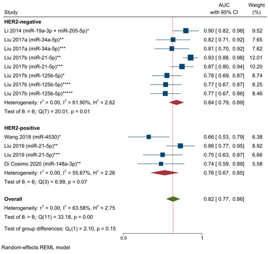 Despite the limited number of available studies, we performed a subgroup analysis based on BC molecular subtypes by excluding two studies [65,66] that included both HER2-positive and HER2-negative molecular subtypes. The selected circulating miRNAs showed higher significant statistical predictive performance for the HER2-negative patients than for the HER2-positive molecular subtype: AUC = 0.84, 95% CI 0.79–0.89, and p < 0.05; AUC = 0.76, 95% CI 0.67–0.85, and p = 0.07. However, the results of test of group differences were not significant (Q = chi (1) = 2.10; p = 0.15). Thus, the miRNAs’ predictive performance was not statistically significant within the two BC patients’ groups (Figure 6).
