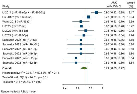 An additional AUC meta-analysis (concerning five studies and twelve effect sizes) was conducted based on baseline miRNA detection (i.e., before NAC) (Figure 7). The AUC pooled estimate of specific baseline miRNA levels was shown to predict responses in a neoadjuvant setting among a mixed population of BC patients (AUC = 0.71, 95% CI 0.65–0.77, and p < 0.05). However, the statistical heterogeneity remained moderate (I2 = 52.62% and significant Q-statistic (chi2 (11) = 24.61; p < 0.05)).