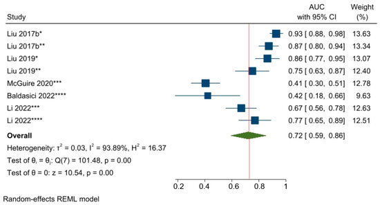 The predictive power of specific baseline miRNAs’ expression and the response to NAC among BC patients (pooled estimate based on AUCs). Li 2014 [62], Liu 2017b [28], Wang 2018 [64], Li 2022 [65], Sadovska 2022 [66].