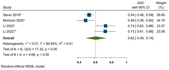 Furthermore, although only three eligible studies and four effect sizes were included, the prognostic value of miR-155-5p was also investigated by converting the OR estimates into AUC values. The pooled AUC value was 0.62, 95% CI 0.49–0.74, and p < 0.05, indicating that miR-155-5p has an almost acceptable ability to predict NAC responses among BC patients (Figure 9).