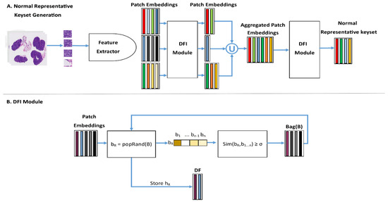 The schematic diagram for constructing NRK. (A) NRKG: The input is all normal WSIs and the output, distinct features (DF), is the set of all distinct normal patch embeddings extracted using it. (B) The distinct features identifier (DFI) module. popRand(.) is a function that randomly selects one element of its input set, i.e., br, and stores br as the distinct embedding. Sim(.) is a function that computes the similarity of br, with bn−1 embeddings, and removes the embeddings with similarity greater than from the bag.