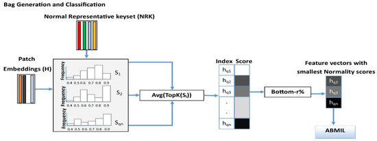 Bag generation and classification. We compare the WSI patch embeddings with NRK, compute the average of TopK similarity scores to compute the normality score of each patch embedding, and select bottom-r% embeddings of a WSI as the input of the ABMIL model.