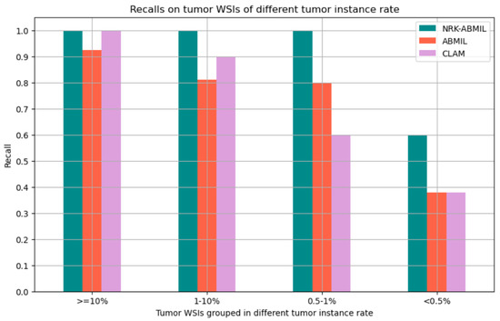 Recall of tumor WSIs based on tumor grouped by tumor instance rate.