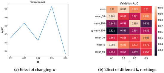 Ablation study of hyperparameters. (a) Effect of changing for NRK generation. (b) Effect of changing k, and r on the validation set. All of these metrics are the averaged fivefold validation AUC.