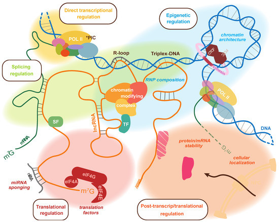 Genome-wide transcriptomic analyses revealed that over three quarters of the human genome can be transcribed and that approximately fifty percent of it may be read at a given time in a single cell [1]. RNAs are broadly classified as protein-coding (messenger RNAs; mRNAs) or non-coding (ncRNAs), the latter being the more diverse class that includes transcripts produced from annotated genes and between them. Gene-encoded ncRNAs can be further categorized into subgroups according to their cellular function, genomic location, and size [2]. Long non-coding RNAs (lncRNAs) are one such subtype longer than 200 nucleotides, encompassing a very large and diverse group of regulatory transcripts. With a few known exceptions [3], lncRNAs are transcribed by RNA polymerase II (POL II) and are thus 5′-capped, 3′-polyadenylated, and often spliced. Different groups estimate that lncRNAs could arise from at least as many (~30,000) or up to almost ten times more genes than those encoding proteins [4,5,6,7]. They are predicted to not code for protein from sequence features such as poor start codon context, uncharacteristic codon usage, and short length of detectable open reading frames that would otherwise trigger nonsense-mediated decay [8]. Curiously, polysome profiling has detected many lncRNAs [9,10] indicating that some do encode peptides [11,12]. Although most of these peptides are thought to lack function [10], some lncRNAs will thus likely require re-classification.