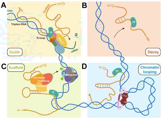 Although lncRNAs and TFs have been independently implicated in cancer, increasing evidence suggests that they also do so together as RNPs. The identification of functional lncRNA–TF complexes frequently come from studies of aberrantly expressed lncRNAs, where gene targets were identified and RNA immunoprecipitation assays were used to validate physical interactions between the lncRNA and a TF also regulating those genes. Such studies usually proceed with the knockdown and/or overexpression experiments that demonstrate cooperativity between the lncRNA and TF for proper gene expression, roles in cancer pathways, and effects on cell proliferation, differentiation, and migration. LncRNA–TF RNPs can either positively or negatively regulate target gene transcription. For example, the HAND2-AS1 lncRNA was found to bind E2F4 at the C16orf74 promoter to downregulate its expression and repress cervical cancer progression. In contrast, HNF1A-AS1 was found to bind PBX3 to increase OTX1 expression and promote angiogenesis through ERK/MAPK signaling in colon cancer [181,182]. While many studies have provided general insight into lncRNA function, other studies delve further into molecular details of the mechanisms employed by lncRNA–TF complexes to regulate genes. In general terms, lncRNAs can participate in control mechanisms as decoys, guides, scaffolds, or modulators of chromatin folding and combinations thereof. These strategies are summarized below and illustrated in Figure 2.