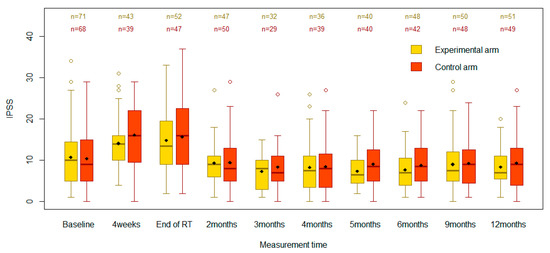 RI-LUTSs can arise during and following prostate RT [17]. Most patients recover from acute urinary toxicity within a few months after treatment [17,18]. Accordingly, in our trial, mean IPSSs increased during and shortly after RT in the ITT analysis, regardless of the study arm. LUTSs improved and returned to baseline levels as early as three months post-RT for both the experimental and control groups. The change in mean IPSS over time was highly significant for each study arm. Yet, the prophylactic medication had no perceptible effects on the participants’ IPSSs. There were no statistically important differences in mean IPSSs between the study groups at all time points in the ITT analysis. Overall, the fluctuations in IPSSs were equivalent across time points for the two study groups. These results imply that the participants likely experienced similar levels of urinary toxicity during and post-RT regardless of the study arm and that the prophylactic use of α-blockers had no measurable effect on the recovery rate.