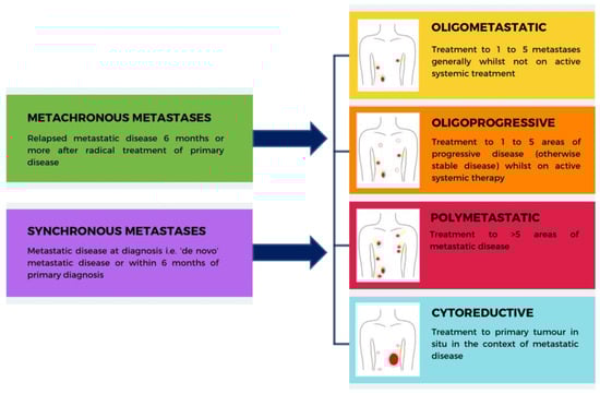 - Liu, Y.; Long, W.; Zhang, Z.; Zhang, Z.; Mai, L.; Huang, S.; Han, H.; Zhou, F.; Dong, P.; He, L. Metastasis-directed stereotactic body radiotherapy for oligometastatic renal cell carcinoma: Extent of tumor burden eradicated by radiotherapy. World J. Urol. 2021, 39, 4183–4190. [Google Scholar] [CrossRef]