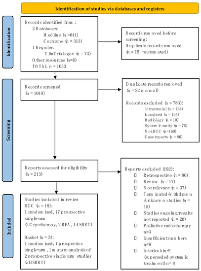 - Correa, R.J.M.; Louie, A.V.; Zaorsky, N.G.; Lehrer, E.J.; Ellis, R.; Ponsky, L.; Kaplan, I.; Mahadevan, A.; Chu, W.; Swaminath, A.; et al. The Emerging Role of Stereotactic Ablative Radiotherapy for Primary Renal Cell Carcinoma: A Systematic Review and Meta-Analysis. Eur. Urol. Focus 2019, 5, 958–969. [Google Scholar] [CrossRef]