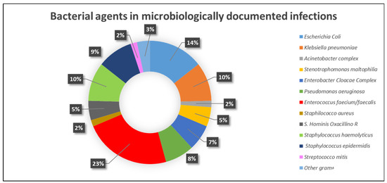 The characteristics of microbiologically documented infections are reported in Table 3. Most of the microbiologically documented infections were of bacterial origin (105/118), while fungal and viral infections occurred in 11 and 2 cases, respectively. Characterization of the bacterial agents is reported in Figure 1.