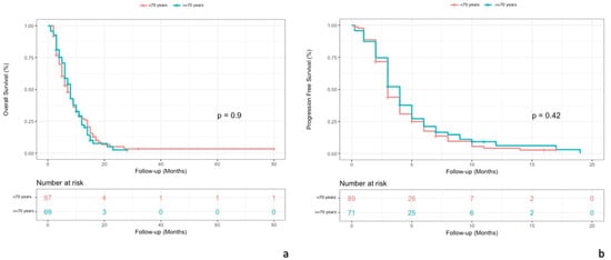 The median PFS was 4 months (95% CI, 3–5) in patients ≥ 70 years old and 3 months (95% CI, 3–4) in patients < 70 years old (p = 0.42). (see Figure 2b)