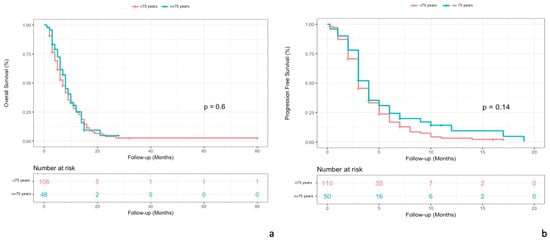 The median PFS was 4 months (95% CI, 3–5) in patients ≥ 75 years old and 3 months (95% CI, 3–4) in patients < 75 years old (p = 0.14). (see Figure 3b).