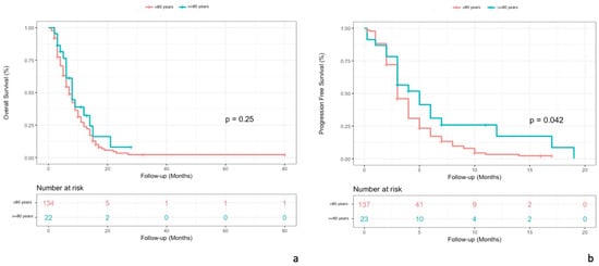 The median PFS was 5 months (95% CI, lower limit 3) in patients ≥ 80 years old and 3 months (95% CI, 3–4) in patients < 80 years old (p = 0.042). (see Figure 4b)