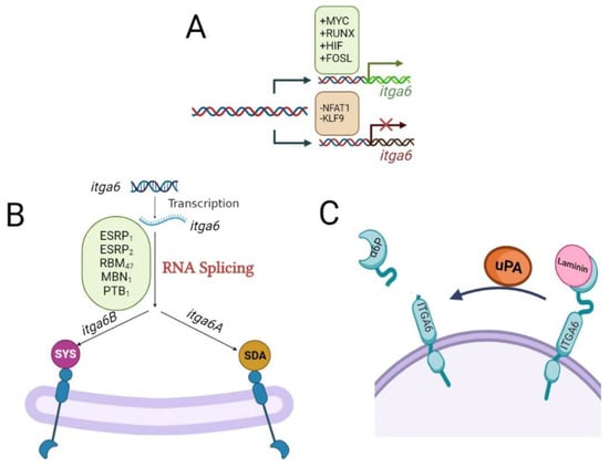 It has been proposed that itga6, itga3, and itga7 might have a common ancestor [27,28]; however, ITGA6 is encoded by the itga6 gene located in chromosome 2 (2q31.1) [29], and its expression is regulated at multiple layers. Multiple transcription factors, including MYC, RUNX1, HIFs, and FOSL1, bind to the itga6 promoter region and enhance its transcription [8,28,30,31,32] (Figure 1A). On the other hand, the nuclear factor of activated T cells (NFAT1) and KLF9 suppress its transcription [8,33] (Figure 1A).