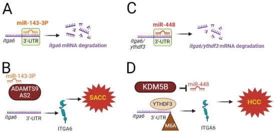 itga6 mRNA is also susceptible to microRNA (miR) regulation. It has been reported that miR-143-3p, a tumor suppressor, reduces tumors by targeting and degrading itga6 [41,42] (Figure 2A). In patients with salivary adenoid cystic carcinoma, ADAMTS9-AS2, an antisense transcript of the protein-coding gene ADAMTS9, is highly elevated, competitively binds to miR-143-3p, and hinders itga6 miRNA-mediated degradation [41] (Figure 2B). In hepatocellular carcinoma, a positive connection between YTHDF3 and itga6 expression was reported. miR-448 targets and degrades ythdf3 and itga6, which prevents cells from self-renewing [42] (Figure 2C).