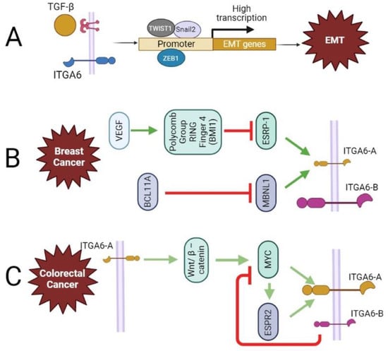 The contribution of ITGA6 in epithelial-mesenchymal transition (EMT) and regulation of its splicing variants. (A) In colorectal cancer cells, the overexpression of ITGA6 increases TGF-b1 signaling, which leads to increased expression of EMT transcription factors such as twist-related protein 1 (TWIST1), zinc finger E-box-binding homeobox 1 (ZEB1), and Snail2. (B) In triple-negative breast cancer (TNBC), VEGF signaling induces polycomb group ring finger 4 (BMI1)-mediated suppression of ESRP-1, consequently causing a decrease in ITGA6-A and an increase in expression of ITGA6-B (breast CSC population). Moreover, highly expressed in TNBC and involved in stem cell destiny, metastasis, and ECM remodeling, B-cell leukemia/lymphoma 11A (BCL11A) suppresses MBNL1, a splicing regulator that promotes the production of the ITGA6-A. (C) Proliferative undifferentiated human intestinal cells (colorectal cancer, CRC) typically express ITGA6-A, which activates the Wnt/β-catenin pathway leading to tumor growth. MYC is a target gene of Wnt/β-catenin, and both ITGA6-A and ESPR2 expressions are controlled by MYC. This suggests a feedforward loop for ITGA6-A. However, ITGA6-B experimental overexpression results in the inhibition of MYC activity.