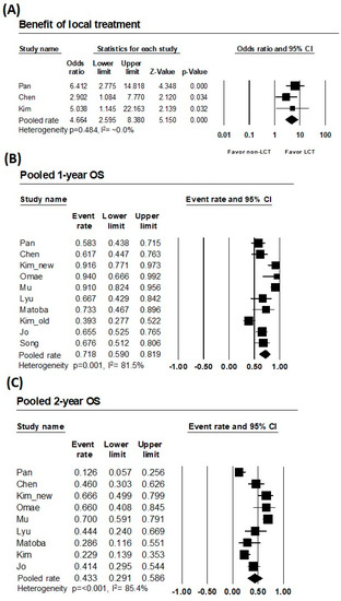 Outcomes of pooled analyses. Forest plots of the (A) pooled odds ratio of comparative series, (B) 1-year, and (C) 2-year pooled overall survival percentiles of cohorts treated with local modalities.