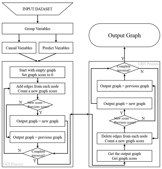 The GGES method is a score-based method [35] derived from the GES Method [30]. The GGES method requires that the employed dataset satisfies the Markov condition [36] and the faithfulness hypothesis [37]. In the GGES method, the score of the graphical model can be calculated using the Bayesian Information Criterion (BIC) score [38] and a generalized score [39]. The GGES method has three steps: