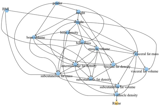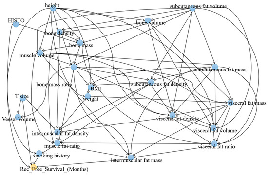 The available studies have shown that several factors are linked to postoperative lung cancer recurrence, including patient-related factors such as smoking, age, or gender [11,12,13,14]; perioperative factors such as surgical trauma, transfusion, hypothermia, and anesthesia [15,16,17]; systemic inflammation [18]; molecular biomarkers [19,20,21]; and image features like tumor and body composition features [22,23,24]. While most of these studies only focused on a limited number of variables, the complex pathophysiology of NSCLC means that many variables may interact with each other with regard to contributing to recurrence. There is, therefore, a need to develop a causal model to understand not just the correlations but the potential causal relationships between the relevant variables that may be associated with lung cancer recurrence. This is especially important for body composition variables, which have been linked to a number of other diseases, including cardiovascular disease [25] and diabetes [26].