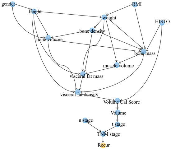 When considering the variables directly linked to lung cancer recurrence, a notable difference was observed in the graphs when pathological stage variables were included. Previously, the direct predictor was density_muscle, but upon inclusion of pathological stage variables, TNM-stage emerged as the direct predictor, followed by T-stage and N-stage. This finding aligns with the well-established understanding that the overall stage, particularly the N-stage, significantly impacts recurrence. Furthermore, the introduction of stage variables resulted in a reduction in the number of significant variables contributing to predicting recurrence. This phenomenon may be attributed to the stronger correlation between body composition variables and stage variables. Consequently, variables such as T-stage alone may not be sufficient to explain the recurrence phenomenon. These findings provide additional evidence supporting the interplay between body composition variables and other extensively studied predictors of recurrence and RFS.