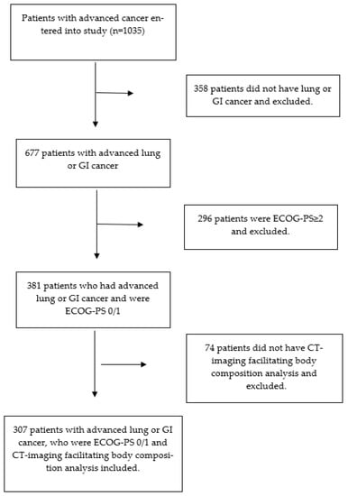 Patients with advanced cancer were identified from an international database. Data were prospectively collected across nine sites in the UK and Ireland between 2011 and 2016 and retrospectively analyzed [9,10,11]. Patients with either advanced lung or GI cancer (defined as locally advanced or with evidence of metastasis) who had good performance stats (ECOG-PS 0/1) and suitable pre-treatment CT images for body composition analysis were considered for inclusion. The primary endpoint was overall survival from entry to the study. The date of death was confirmed using hospital electronic records until 18 June 2018, which served as the censor date.