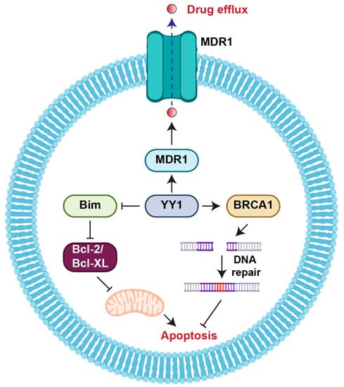 Schematic diagram illustrating the mechanism of YY1 regulation in tumor drug resistance. YY1 promotes drug resistance through regulation of the DNA repair response, anti-apoptotic proteins, and drug efflux transporters. Bcl-2: B-cell lymphoma-2; Bcl-XL: B-cell lymphoma-extra large; Bim: Bcl-2 interacting mediator of cell death; BRCA1: Breast cancer-associated gene 1; MDR1: multidrug resistance protein 1.