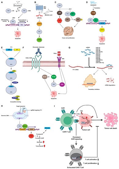 CAR-T cell therapy is a type of immunotherapy that involves engineering T cells to express chimeric antigen receptors that can recognize specific antigens on tumor cells. Whereas this approach has been successful in some patients, others do not respond or develop resistance to treatment []. Combining YY1-targeted therapy with CAR-T cells may help overcome resistance and improve response rates. One factor that can contribute to resistance is the expression of PD-L1 on tumor cells or the tumor microenvironment, which can inhibit CAR-T cell activity as these cells express programmed cell death protein 1 (PD-1) []. To address this, blocking immune checkpoints such as PD-1 may enhance the efficacy of CAR-T cell therapy. Previous studies combining anti-PD1 antibodies with CAR-T cells have shown promising results in a subset of patients [,,,]. Inhibition of YY1, which is a regulator of PD-L1 expression, maybe a promising strategy to overcome resistance in CAR-T cell therapy and improve patient outcomes.