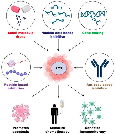 As a target for antitumor therapy, several approaches have been explored to target YY1, including small molecule inhibitors, RNA interference, and gene editing techniques. Small molecule inhibitors that disrupt the interaction between YY1 and its DNA binding sites have shown promising results in preclinical studies by inhibiting tumor growth and metastasis in various types of cancer [,,]. Knocking down YY1 using RNA interference has also demonstrated efficacy in inhibiting tumor growth and sensitizing tumor cells to chemotherapy [,]. In preclinical studies, YY1 knockdown promotes apoptosis, inhibits cell proliferation, and enhances the effectiveness of chemotherapy in tumor cells. These findings suggest that targeting YY1 could be a promising strategy for tumor therapy. Additionally, gene editing techniques, such as clustered regularly interspaced short palindromic repeats (CRISPR)–CRISPR-associated (Cas) 9 (CRISPR-Cas9), have shown promise in preclinical studies as a means of targeting YY1 for antitumor therapy. Preclinical studies on gene editing techniques have demonstrated promising results in inhibiting tumor growth and metastasis in various types of cancer, including breast cancer, prostate cancer, and liver cancer [,,]. However, clinical data on YY1-targeted therapies are currently lacking and further research, including clinical trials, is needed to fully demonstrate the safety and efficacy of YY1-targeted therapies in tumor patients. Nevertheless, the emerging evidence for the role of YY1 in cancer highlights its potential as a potential target for future research [,].