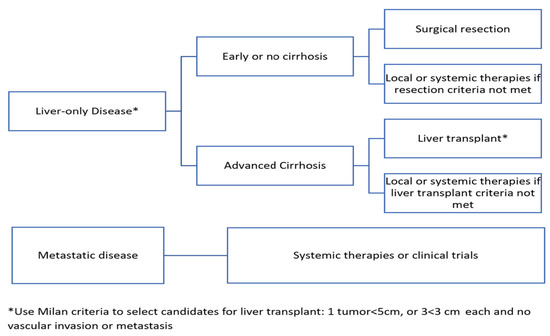 Reducing tumor burden in patients with advanced HCC whose disease is beyond the Milan criteria with the goal of future transplant is referred to as downstaging therapy. Factors such as waitlist time, tumor burden, and alpha-fetoprotein response to downstaging therapy have been shown to influence post-transplant outcomes [29]. Downstaging can be performed with surgery, systemic therapy, or locoregional therapies [30,31,32,33,34,35].