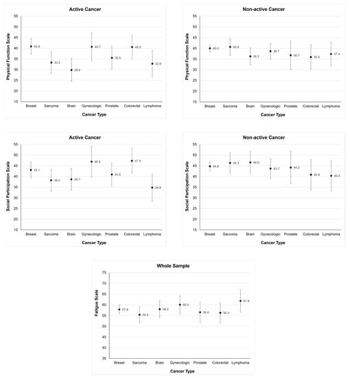 - Smith, S.R.; Vargo, M.; Zucker, D.S.; Shahpar, S.; Gerber, L.H.; Henderson, M.; Jay, G.; Cheville, A.L. Responsiveness and interpretation of the PROMIS Cancer Function Brief 3D Profile. Cancer 2022, 128, 3217–3223. [Google Scholar] [CrossRef]