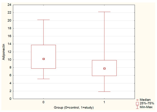 Adiponectin levels were significantly higher in the control vs. the study group (p < 0.001) (Figure 1, Table 2). Leptin levels as well as the leptin–adiponectin ratio did not differ significantly between the study and control groups (Table 2).