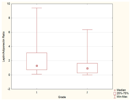 Leptin and adiponectin levels, as well as the leptin–adiponectin ratio, were assessed by the tumor grade. An increased leptin–adiponectin ratio was observed in grade 1 PanNENs vs. grade 2 PanNENs (Figure 2, Table 4). Adiponectin or leptin levels separately did not differ by grade (Table 4).