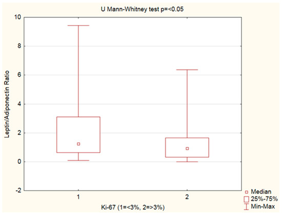 Leptin, adiponectin levels, andthe leptin–adiponectin ratio were analyzed by Ki-67%. An increased leptin–adiponectin ratio was observed in PanNENs with Ki-67 < 3% vs. Ki-67 ≥ 3% (Figure 3, Table 5).