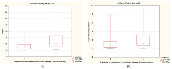 Finally, we questioned whether the leptin and adiponectin levels or their ratio showed any differences according to the disease stage. Serum levels of leptin and adiponectin as well as leptin–adiponectin ratio were assessed depending on the presence of metastases. Similar to the results of the analysis with regard to Ki-67% and tumor grading, patients with distal disease presented lower leptin concentration and decreased leptin–adiponectin ratio.