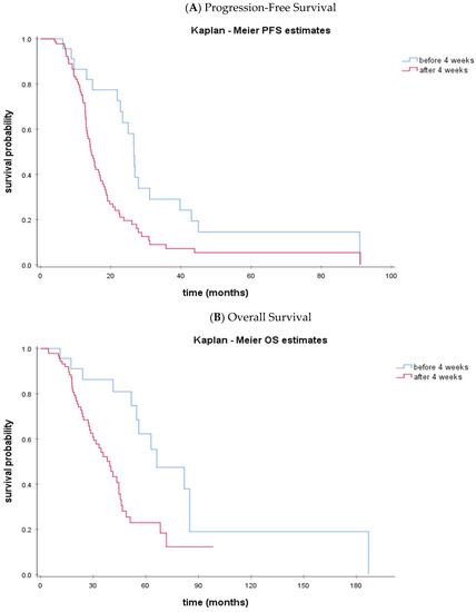 Kaplan-Meier curves of PFS (A) and OS (B) according to the time interval from NACT to IDS: <4 weeks (blue line) vs. ≥4 weeks (red line).