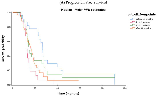 We performed a Cox regression analysis of the factors that influence PFS and OS in HGSC patients undergoing IDS. Initial status of disease (IIIC or IV), debulking status (optimal vs. suboptimal), ECOG performance status, and interval from NACT to IDS (<4 weeks vs. ≥4 weeks) were included in the analysis. Again, the performance of IDS within 4 weeks after the last dose of NACT retained its statistical significance in terms of PFS (p = 0.004) and OS (p = 0.003). Optimal debulking was also an independent factor in both PFS (p = 0.008) and OS (p = 0.001) (Table 4).