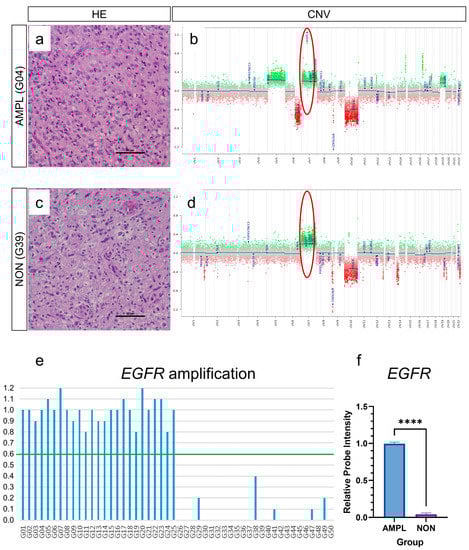 Analysis of EGFR amplification. Analysis of EGFR amplification in glioblastoma IDH wildtype CNS WHO grade 4 was performed by evaluating relative probe intensities of copy number profiles generated during methylation analysis. Fifty glioblastoma samples were included, with twenty-five samples showing EGFR amplification (i.e., relative probe intensities of more than 0.6, indicated by red circle) (a,b), and twenty-five showing no EGFR amplification (i.e., relative probe intensities of less than 0.6, indicated by red circle) (c,d). Of all glioblastomas, (e) mean EGFR probe intensity level of amplified glioblastomas was 0.99, and of non-amplified was 0.04 (f). (a,c): scale bar: 50 µm; **** p < 0.0001.