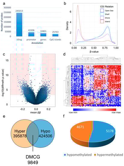 Exploratory methylation analysis. After probe removal and filtering, exploratory methylation analysis was performed on 820,384 probes that remained: 245,013 were annotated with tiling regions, 43,306 were annotated with promoters, 33,801 were annotated with genes, and 25,763 were annotated with CpG islands (a). Analysis of beta value distributions and probe categories showed that CpG islands represent high densities of unmethylated beta values, while shelf and open sea regions showed higher densities of methylated values with an intermediate distribution of shores (b). Volcano plot showed distribution of differential methylation values (Δβ) and significance level (−log10); thereby, probes with Δβ ≥ 0.1 and p-value < 0.05 are indicated in red color (c). Hierarchical clustering of top 100 DMCGs showed distinct clusters using Manhattan distance (d). Each pairwise comparison of probes resulted in 9849 significantly differentially methylated probes (Δβ ≥ 0.1, p-value < 0.05) (e), with 5178 probes being hypermethylated and 4671 probes being hypomethylated (f).