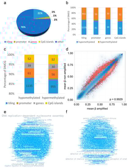 Next, we performed gene enrichment analysis of identified DMCGs. Of the 9849 significantly DMCG, 2380 are annotated with 2090 tiling regions (21%), 117 promoter regions (1%), 69 gene regions (1%), and 104 CpG island regions (1%) (Figure 3a), and 7460 are located at other loci.