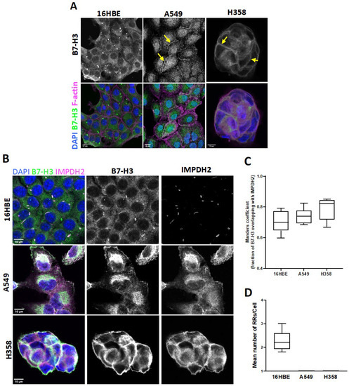 16HBE normal human bronchial epithelial cells, adenocarcinoma human alveolar basal epithelial cells A549, and bronchioalveolar carcinoma cell line NCI-H358 (all purchased from ATCC) were used in this study. Cells were grown in Minimum Essential Media (MEM) for 16HBE cells, Dulbecco’s modified eagle medium (DMEM) for A549, and RPM I-1640 for the NCI-H358 cells. Media were supplemented with 10% v/v foetal calf serum, 2 mM L-Glutamine, 100 units/mL penicillin, and 0.1 mg/mL streptomycin. B7-H3 CRISPR cell lines were established via transient transfection of A549 and H358 parental cells with the CD276 CRISPR Guide RNA vector carrying a GFP tag. The GFP-tagged cells were sorted 24 h post-transfection using flow cytometry to obtain a homogenous but non-clonal cell population. 16HBE cells did not respond to any of the B7-H3 CRISPR knockdowns and thus B7-H3 siRNA was used. Cells presenting the lowest B7-H3 expression level were chosen for further experiments. B7-H3 depletion was validated via sequencing, qPCR, Western blot, and immunofluorescence. Cell lines were treated with MPA to block IMPDH2 activity (1 µM for 24 and 48 h); methanol was used as a control.