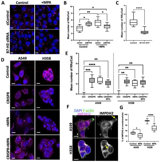 To determine whether this role for B7-H3 in RR/IMPDH2 function was unique to normal lung epithelial cells, we analysed RR formation in control and B7-H3 CRISPR A549 and A358 cells. Neither cancer cell line assembled RRs under basal conditions (as shown in Figure 1), but B7-H3 depletion led to a significant increase in RR assembly (Figure 2D,E). The re-expression of B7-H3 in A549 CRISPR cells reduced RRs back to levels seen in the control cells, demonstrating the specificity of the CRISPR targeting (Figure S3F,G). MPA treatment induced RR formation to a similar degree in parental and B7-H3 CRISPR cells (Figure 2D,E), and induced B7-H3 recruitment to RRs (Figure S3H). This is in contrast with 16HBE cells, which showed fewer RRs/cell in MPA-treated B7-H3 knockdown cells compared to MPA-treated controls. Interestingly, MPA treatment also resulted in a significant reduction in plasma-membrane-associated IMPDH2 in A549 and H358 cells (Figure 2F,G), suggesting that this may represent the key active pool of IMPDH2 in cancer cells. These findings collectively demonstrate that B7-H3 suppresses RR formation under basal conditions. However, B7-H3 depletion reduces the formation of IMPDH2 containing RRs in the presence of MPA in cancer cells, indicating that B7-H3 plays a key role in the control of RRs, and therefore potentially in IMPDH2 activation status, under stress conditions.