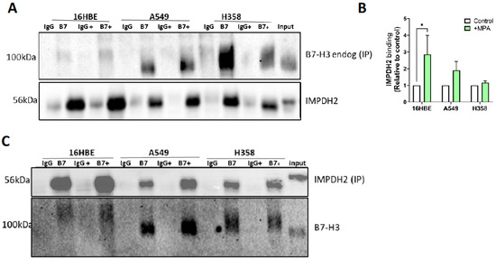 16HBE, A549, and H358 cells were treated with or without MPA and lysed in 500 μL of IP Lysis buffer (50 mM Tris Base, 150 mM NaCl, 1 mM EDTA, 50 mM Sodium fluoride, 1% NP-40, 1% Triton X-100, protease and phosphatase inhibitors). Lysates were then rotated for 15 min at 4 °C and incubated with A/G agarose affinity matrix suspension. To pre-clear the lysates, the latter were incubated with A/G beads at 4 °C on a rotator and then centrifuged at 2000× g at 4 °C. The supernatant was split into tubes containing 3 µg of B7-H3, IMPDH2, or control IgG antibody and left tumbling overnight at 4 °C. A total of 100 ul of washed protein A/G bead slurry was added to the antibody/lysates mixture and tumbled for 2 h at 4 °C. Samples were then spun down at 2000× g for 3 min at 4 °C, the supernatant was discarded, and the beads were washed. Beads were boiled with 50 μL of 2× sample buffer containing (1:200) β-mercaptoethanol for 10 min at 95 °C and samples were loaded on a 10% SDS PAGE gel and subjected to immunoblotting using the specified antibodies.