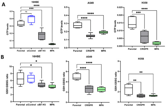 Reducing B7-H3 leads to reduced IMPDH2 pathway metabolites. (A) Graph of GTP levels quantified via mass spectrometry in parental/siControl, B7-H3 siRNA/CRISPR knockdown, and MPA treated in 16HBE, A549, and H358 cells. (B) Quantification of GSH:GSSG ratio in cells, as in (A). n = 6 samples per condition from 2 independent experiments. Values are plotted as mean ± SEM. One-way ANOVA was used to determine statistical significance. * = p < 0.05, ** = p < 0.01, *** = p < 0.001, **** = p < 0.0001.